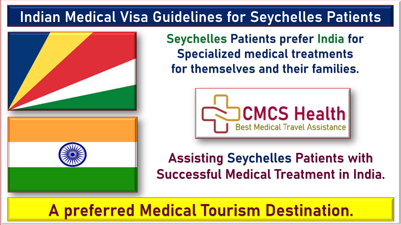 Seychelles Patients visit India for medical treatments. India is one of the preferred Medical Tourism Destination for Seychelles Patients. CMCS Health, the Best Medical Tourism Company assists Seychelles Patients with their Medical Visa from Seychelles to India. Seychelles patients are granted Indian medical visas from Seychelles to India if the sole purpose of their visit is to get medical treatment for themselves or to accompany a Seychelles patient as their medical attendant. Seycheslles Patients chose India for specialized medical treatment for themselves and their family members because of the comparatively lower cost and quality of healthcare services in India.
