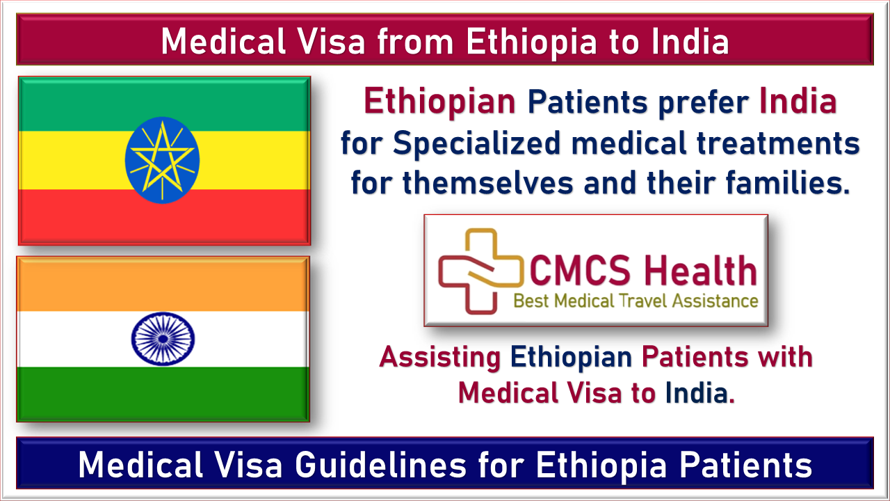 Hundreds of Ethiopian Patients visit India for Medical treatments. Patients from Ethiopia seeking affordable and best-quality medical treatment in India must get Medical Visas from Ethiopia to India to visit India. An Ethiopian Patient coming to India for Medical treatment will be granted a Medical Visa (MED). At the same time, the co-travelers with the Ethiopian patients will be given the Medical Attendant Visa (MED X). CMCS Health, the best Medical Tourism Provider Agency in India assists Ethiopian patients in procuring Medical visas from Ethiopia to India.
