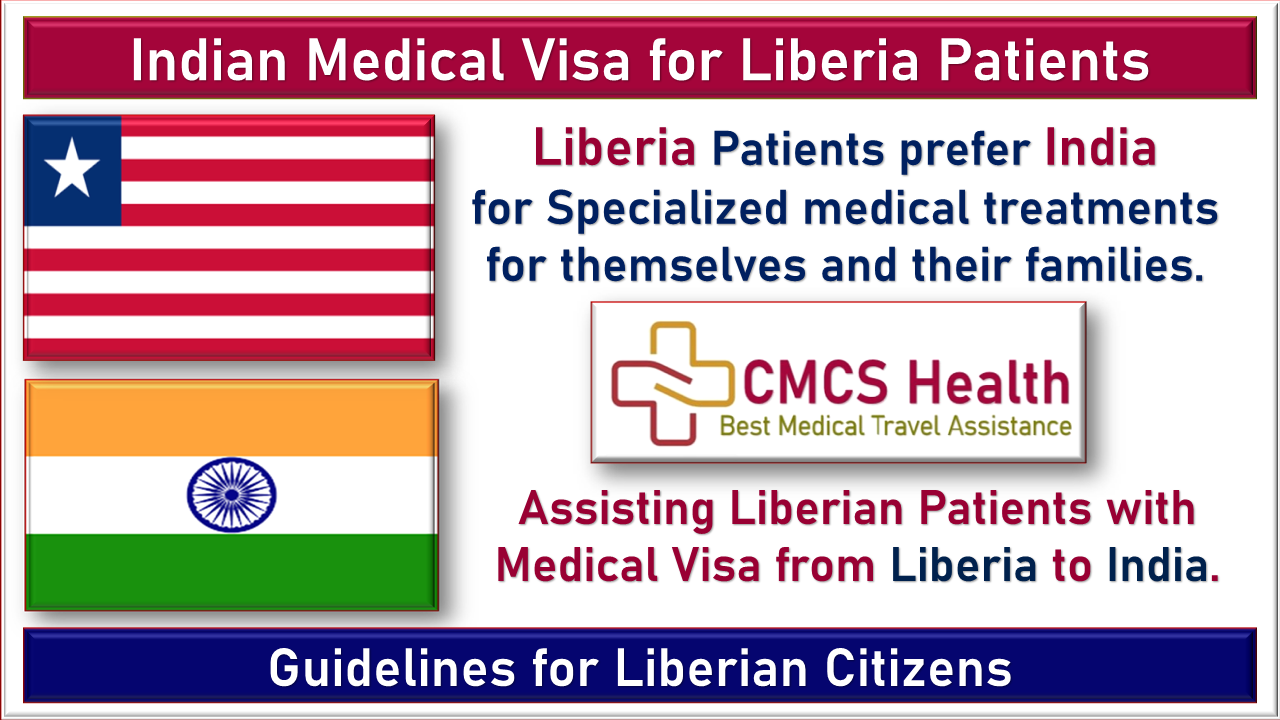 Liberia Patients visit India for Medical treatments. Patients from Liberia seeking affordable and best-quality medical treatment in India must get Medical Visas to visit India. A Liberian Patient coming to India for Medical treatment will be granted a Medical Visa (MED). At the same time, the co-travelers with the Liberia patients will be given the Medical Attendant Visa (MED X). CMCS Health, the best Medical Tourism Provider Agency in India, assists Liberia patients in procuring Medical visas from Liberia to India.