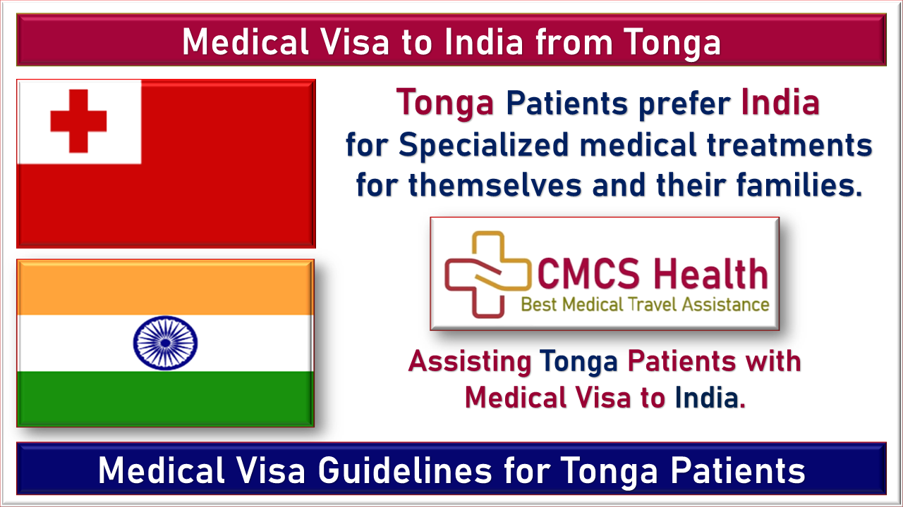 Tonga patients visit India for Medical treatments. Patients from Tonga seeking affordable, high-quality medical treatment must get Medical Visas to visit India. A Tonga patient coming to India for Medical treatment will be granted a Medical Visa (MED). At the same time, co-travelers with the Tonga patients will be given the Medical Attendant Visa (MED X). CMCS Health, India's best Medical Tourism Provider Agency, assists Tonga patients in procuring Medical visas from Tonga to India.