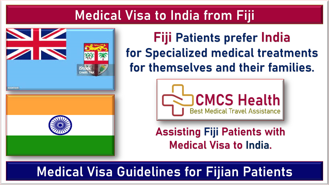 Fijian patients visit India for Medical treatments. Patients from Fiji seeking affordable, high-quality medical treatment must get Medical Visas to visit India. A Fijian patient coming to India for Medical treatment will be granted a Medical Visa (MED). At the same time, co-travelers with the Fijian patients will be given the Medical Attendant Visa (MED X). CMCS Health, the best Medical Tourism Provider Agency in India, assists Fijian patients in procuring Medical visas from Fiji to India.
